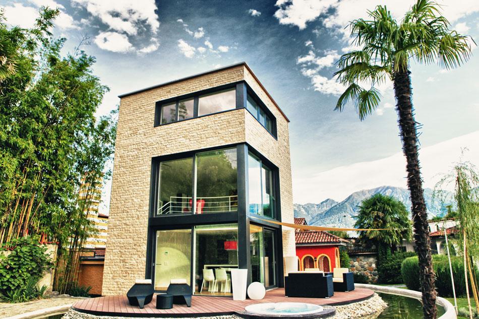 Suite présidentielle sur trois étages : premier étage avec terrasse et jacuzzi avec cuisine, deuxième étage avec salon et troisième étage avec chambre à coucher.